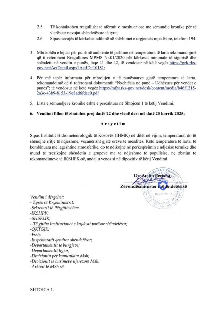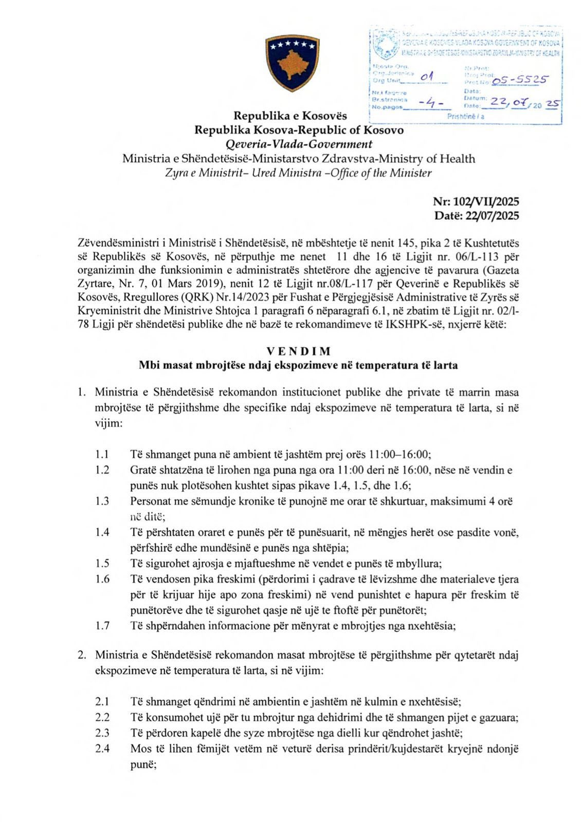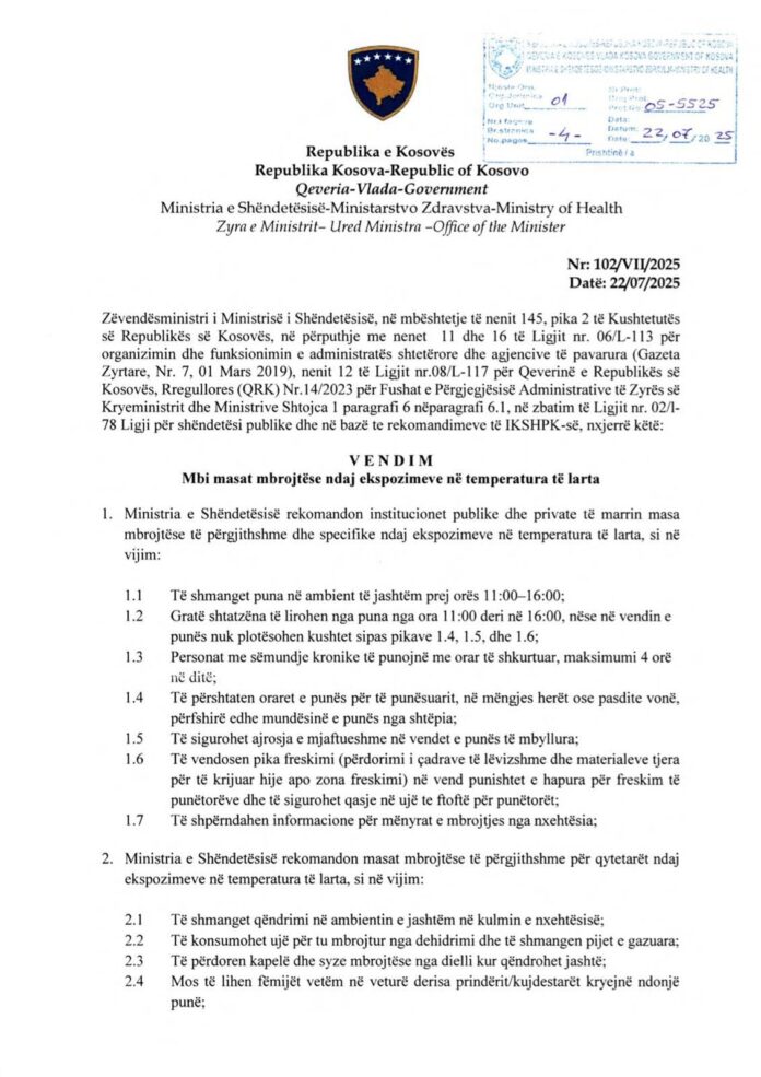 Prishtinë, 22 korrik 2025 – Ministria e Shëndetësisë e Kosovës, duke u bazuar në rekomandimet e Institutit Kombëtar të Shëndetësisë Publike (IKSHPK), ka lëshuar një thirrje zyrtare për institucionet publike dhe private që të ndërmarrin masa mbrojtëse për punëtorët për periudhën 22 – 25 korrik, për shkak të temperaturave të larta ekstreme që po përfshijnë vendin.