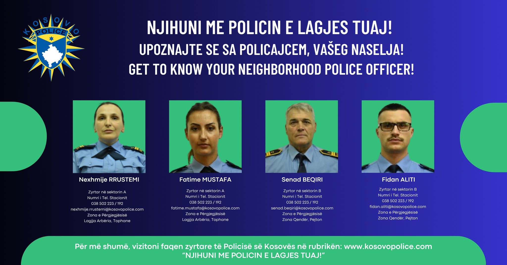 🔗 Vizitoni faqen zyrtare të Policisë së Kosovës dhe në rubrikën “Njihuni me Policin e Lagjes Tuaj” gjeni të gjithë zyrtarët sipas drejtorive rajonale dhe lagjeve që mbulojnë.