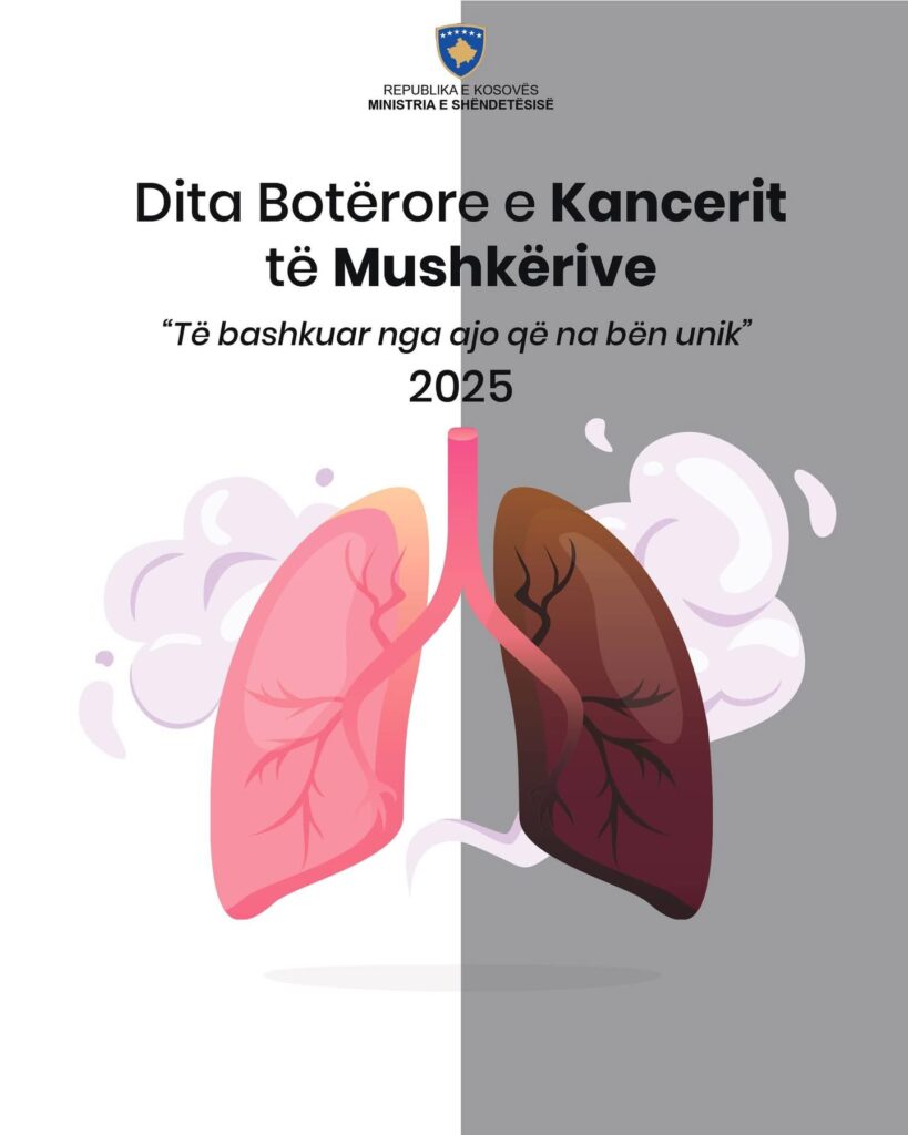 Në Ditën Botërore të Kancerit të Mushkërive, Ministria e Shëndetësisë ka dhënë një mesazh të fuqishëm për ndërgjegjësim dhe veprim të menjëhershëm ndaj kësaj sëmundjeje vdekjeprurëse, duke e theksuar rëndësinë e zbulimit të hershëm dhe parandalimit. Motoja e këtij viti, “Të bashkuar nga ajo që na bën unik”, i fton të gjithë – qytetarë, profesionistë shëndetësorë dhe institucionet – që të përqendrohen në humanizmin e kujdesit ndaj pacientëve dhe të përmirësojnë shanset për mbijetesë.