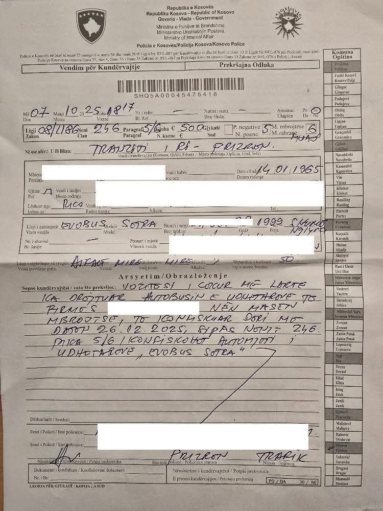 Pas verifikimit të dokumentacionit, u konstatua se shoferi kishte të ndaluar drejtimin e automjeteve deri më 26 dhjetor 2025. Si rezultat, në zbatim të Ligjit për Trafikun Rrugor nr. 08/L-186, ndaj tij u morën masa ligjore përkatëse: