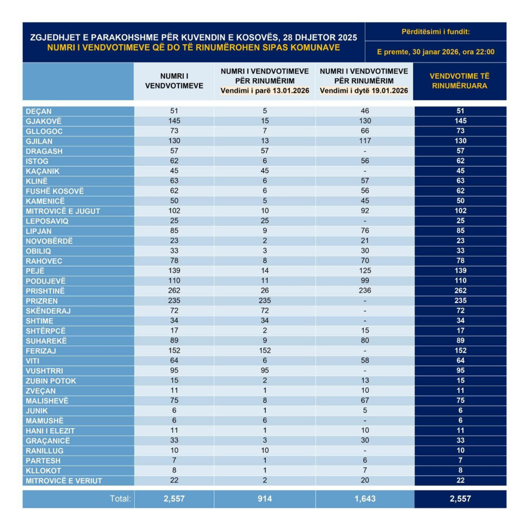 Sipas njoftimit zyrtar, rinumërimi ka përfshirë gjithsej 2,557 vendvotime, proces i cili është zhvilluar me qëllim të rritjes së transparencës dhe garantimit të saktësisë së rezultateve zgjedhore.